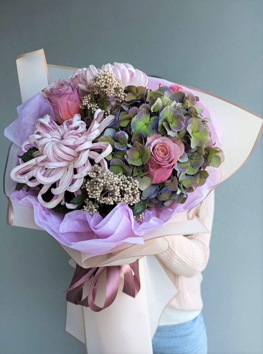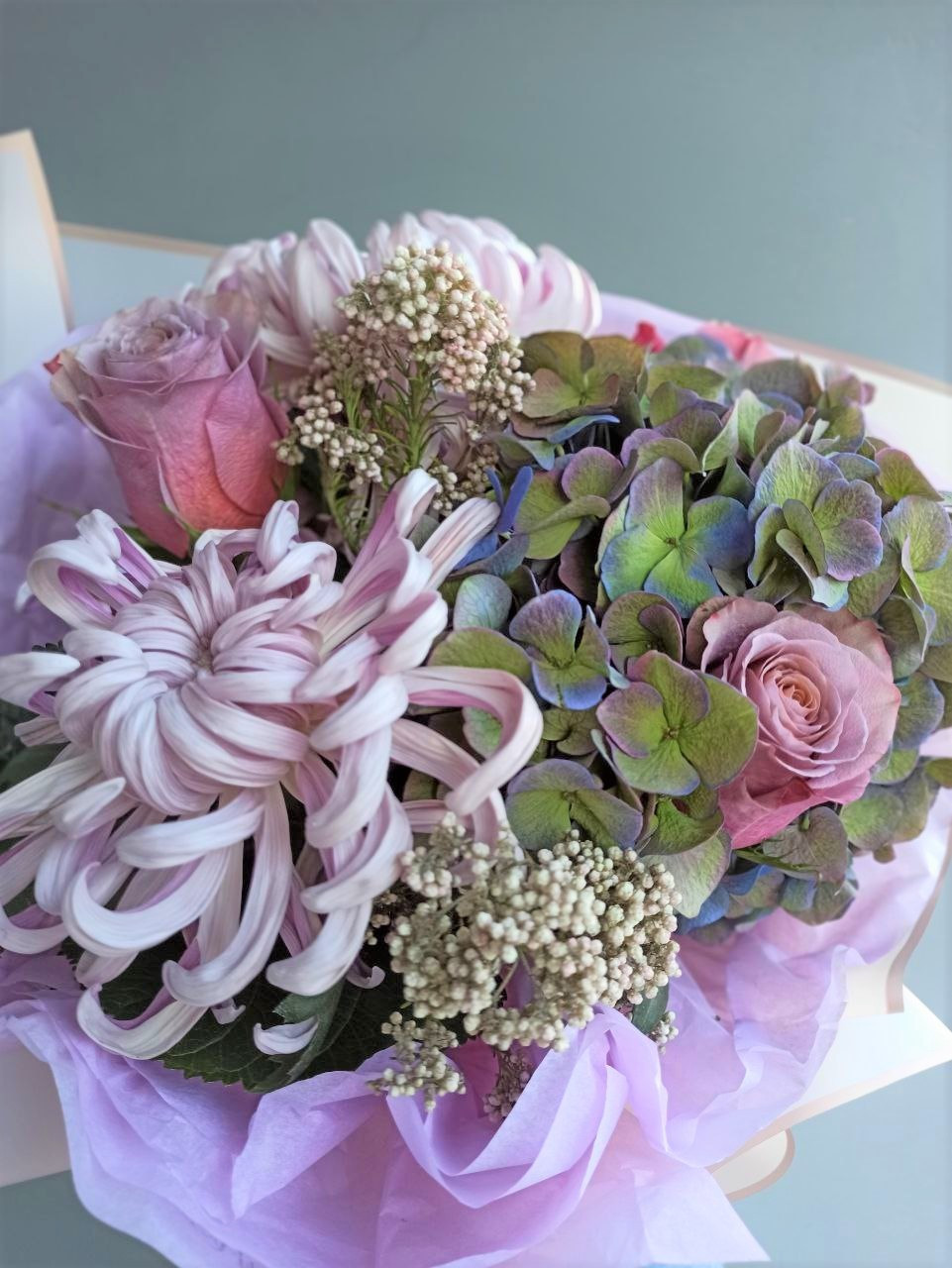 Ten szykowny bukiet skutecznie podkreśla urodę świeżych kwiatów. Dodatkowego uroku bukietowi nadaje niestandardowy design.