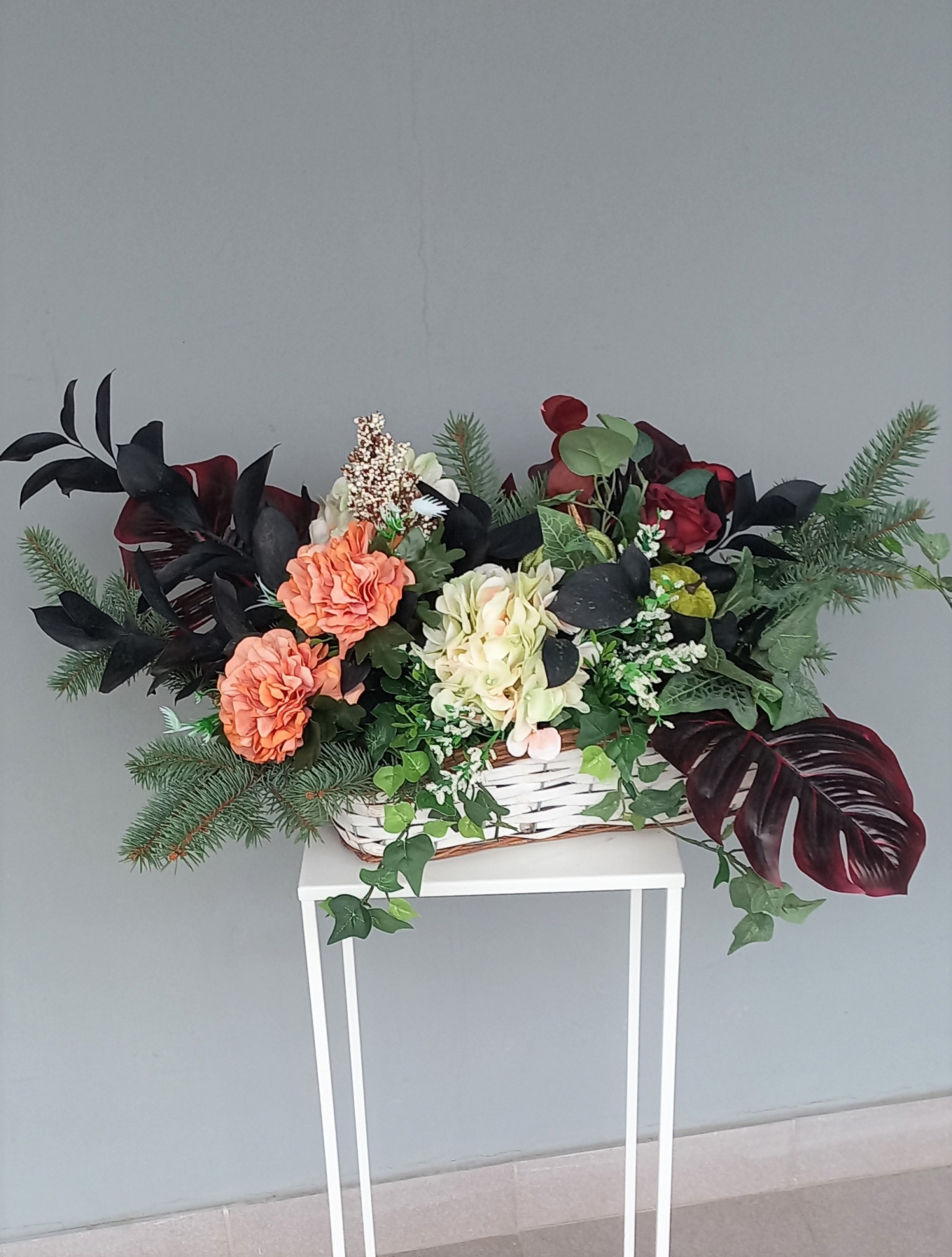 | Skład: | Kompozycja w wiklinowym koszu, wykonana ze sztucznych kwiatów i świerku. |